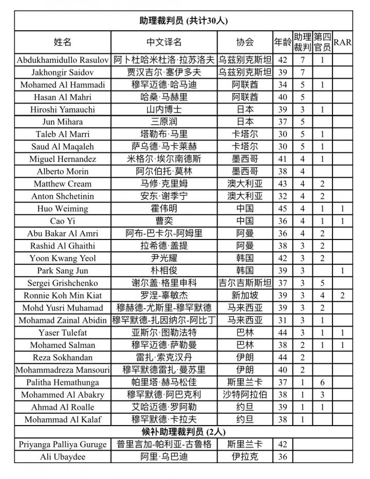 (注:RAR为替补助理裁判的简称,也称为“第五官员”。自1/4决赛开始启用VAR后,每场比赛的场上裁判组均由5人组成,若裁判员出现意外情况不能执法比赛将由第四官员替换,若助理裁判员出现意外情况不能执法比赛则由替补助理裁判员替换)
