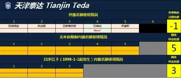 除去新援瓦格纳外,球队还与另外两名外援阿奇姆彭和巴斯蒂安斯成功续约,前者作为队内头号射手上赛季共打入17粒进球,打破泰达队单赛季外援进球记录,排在射手榜第6位;后者则是球队后防中流砥柱,上赛季首发出场29次,出场时间排在全队第一。而另外一名外援乔纳森作为曾经K联赛的金靴在有限的时间内也是打进了8粒进球,此外,他曾在去年足协杯对阵卓尔队的比赛中首发出场。