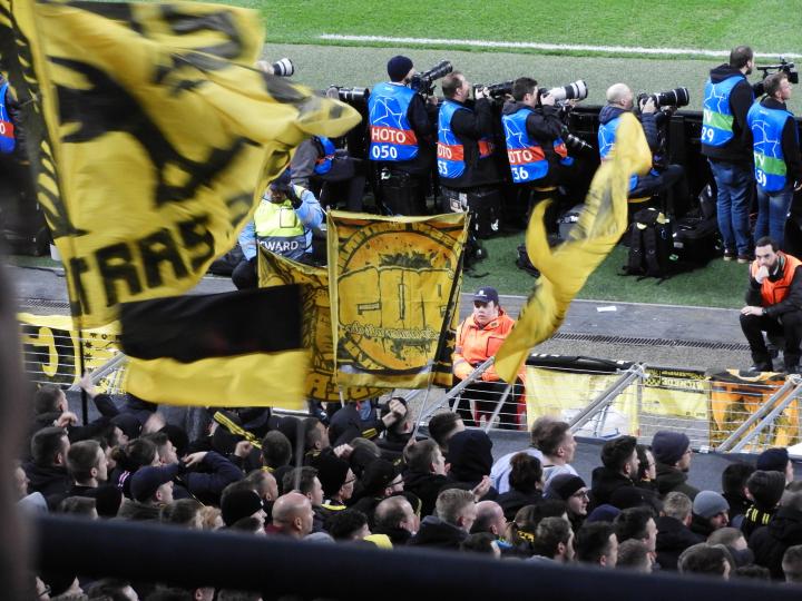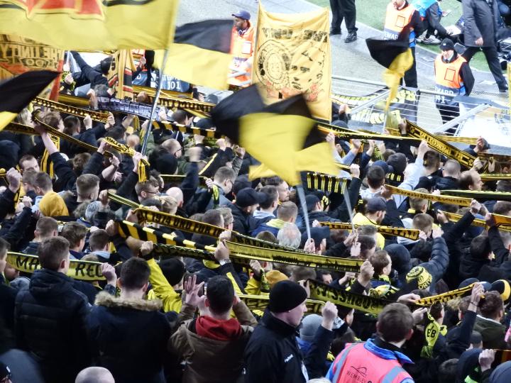 随着一声哨响,比赛结束,热刺3-0多特蒙德,获得了淘汰赛第一场的胜利。热刺球迷自然是欢天喜地,但远道追随客队而来的死忠们并没有立即离场,而是集体举起了应援围巾展示自己从未改变过的黄黑之心。