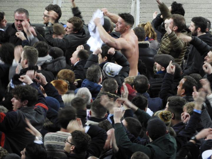 此时此刻球迷们不淡定了。兴奋的热刺球迷开始跟邻近的客队球迷对,对喷……