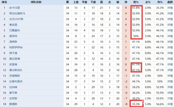 从上图盘路数据我们可以看出,除去已经降级的乌汶UMT联之外,泰超联赛一共有5支赢盘率超过50%的球队,这5支球队分别是尚卡汶里、那空拉查斯马、春武里、巴蜀基利和查英特。作为上赛季的泰超盘王,尚卡汶里虽然排名不高,但是赢盘能力却格外强悍,整个赛季下来,其赢盘能力高达61.8%。而泰超三强武里南、曼谷联合和蒙通联,赢盘能力分列第11、12和18名。(泰超球队数量,上赛季共18支,本赛季为16支)