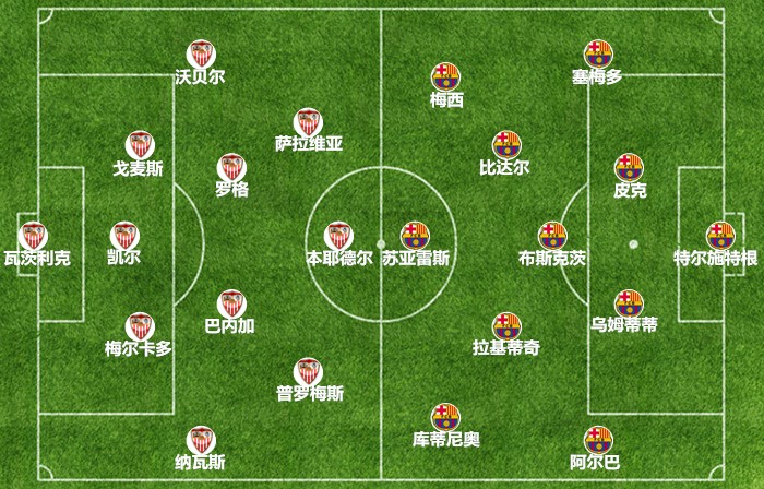 在一月底的国王杯1/4决赛阶段,巴塞罗那和塞维利亚曾有过两回合较量。在首回合大轮换输球的情况下,红蓝军团在次回合精英尽出完成逆转。在那场大胜中,梅西和阿图尔联手完美地控制了中场,苏亚雷斯不断回撤支援中场也起到了关键作用,马钦没能利用巴萨缺乏快马的弱点从边路寻找突破口,导致防线全面陷入被动。