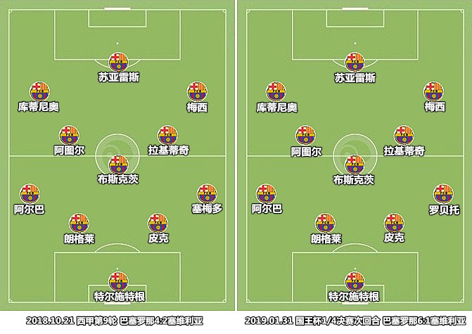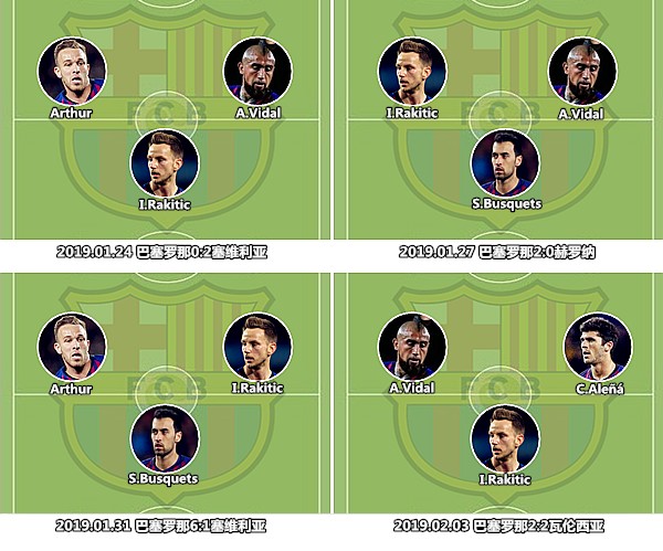从2018年11月开始,奥斯曼-登贝莱逐渐远离负面新闻,开始快速成长为了诺坎普的新宠儿。登贝莱能够提供其他球员无法带来的纵向杀伤效果,不错的球商和学习能力帮助他与搭档之间迅速建立了默契,与之存在竞争关系的库蒂尼奥越来越多地担任替补。库蒂尼奥的失势是世界杯后遗症的影响(体能&伤病),根源在于他的打法无法与梅西和阿图尔形成很好的互补。巴尔韦德决定了在比分落后时采用四前锋战术,一方面是基于塞维利亚首发阵容的中场人数较少,另一方面也是因为阿图尔伤停,库蒂尼奥作为衔接中场和锋线的角色不会与队友存在位置重叠的问题。