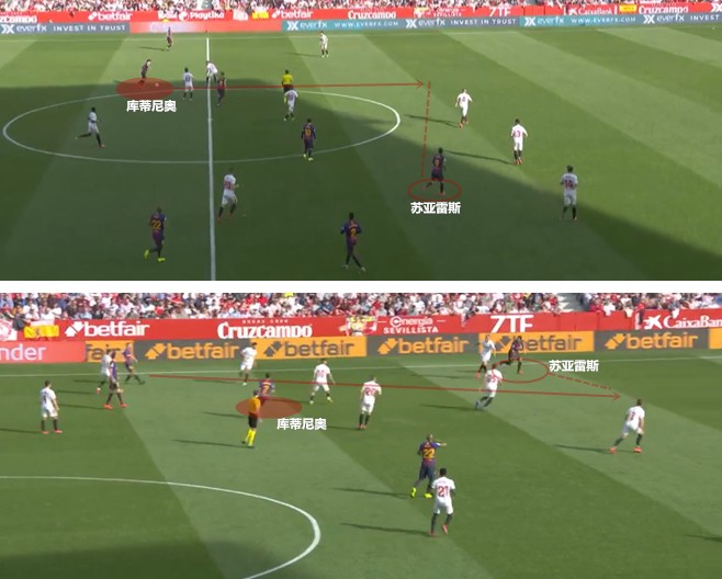 就像国王杯次回合较量时一样,苏亚雷斯拿出了相当一部分精力来保证中场的运输。考虑到塞维利亚在中场人手众多,库蒂尼奥近期在推进时失误比较,巴尔韦德没有安排巴西人在中场过多地持球,还是增加左路的人数,用传球来解决问题。苏亚雷斯不断地在边路背身持球为队友铺路搭桥,或者以边路为起点接应直塞冲击禁区。拉边或回撤持球固然是苏亚雷斯的既定打法,但在体能状态不佳的时候,还要过多地承担这些任务只能加剧这位老将的消耗,影响他在前场处理球时的稳定性。