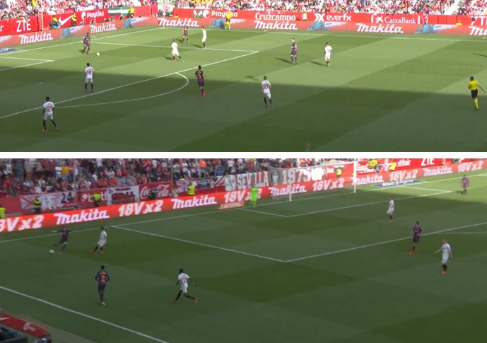 巴萨通过左路打开局面,塞维利亚开始适时回收打反击,巴萨右路的梅西、比达尔和塞梅多开始在前场形成串联。然而,这个组合在前场明显缺乏连续传切的能力,局部的传跑配合也不顾默契,塞梅多不敢过分前压助攻,比达尔在肋部的无球跑动与同伴对不上点。塞维利亚打破僵局的进球来自于普罗梅斯对梅西的抢断,根源就是巴萨的右路陷入了停滞,左路的无球跑动也没有跟上,梅西在无法形成突破、找不到传球点的情况下只能冒险直塞。