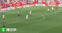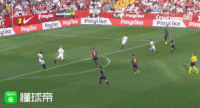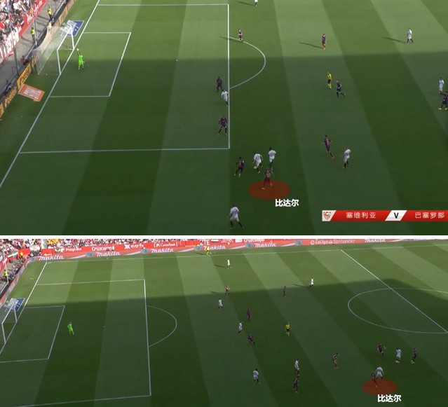 (图)塞维利亚左路连续完成传切,当他们发动向前传递时,比达尔总是被甩在身后。