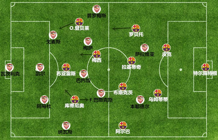 登贝莱和罗贝托的联袂出场极大地改变了进攻的面貌,巴萨利用堆积前锋制造出的战术红利完成逆转,登贝莱助攻梅西打进了扳平比分的进球;在马钦开始试图通过加强中场(换上弗朗哥-巴斯克斯&梅萨)来切断巴萨运输线的时候,阿莱尼亚的出场让中场变得瞬间流畅起来,塞维利亚的反攻起势被压制了下去,阿莱尼亚和罗贝托联手造就了梅西的第三粒进球。