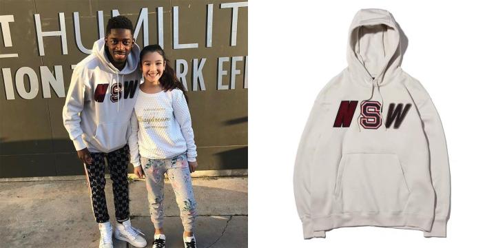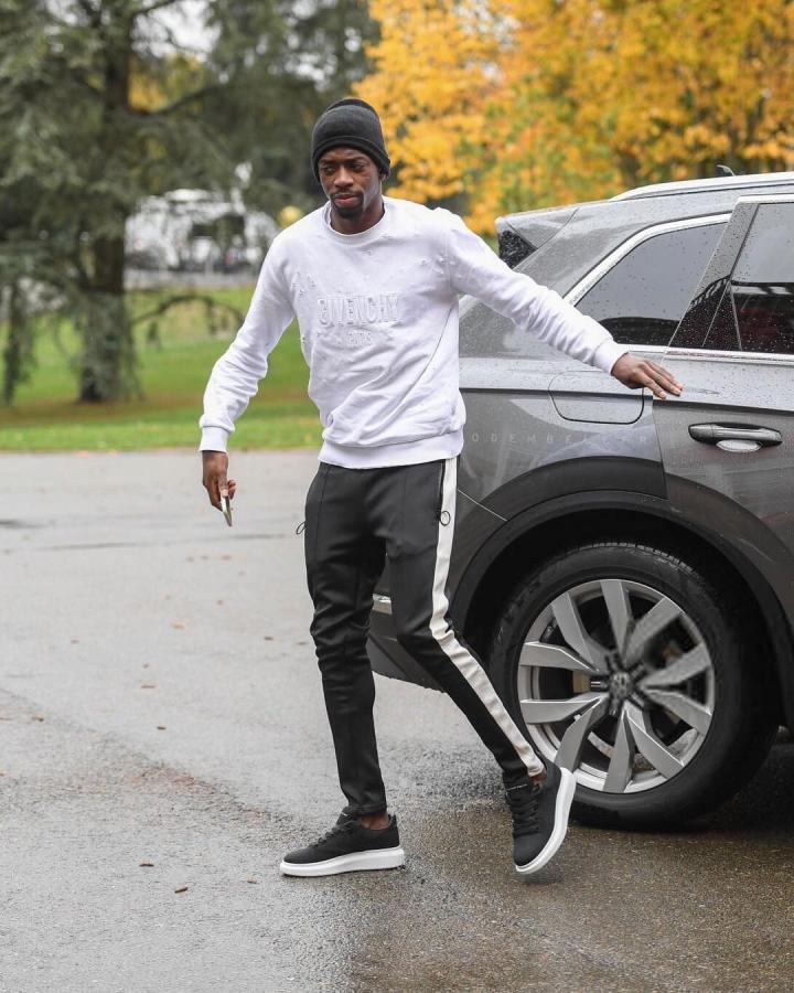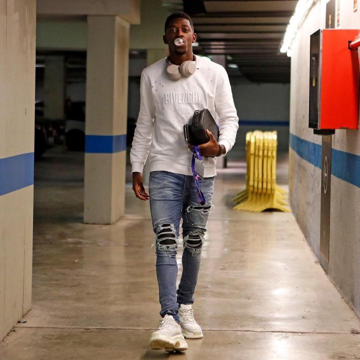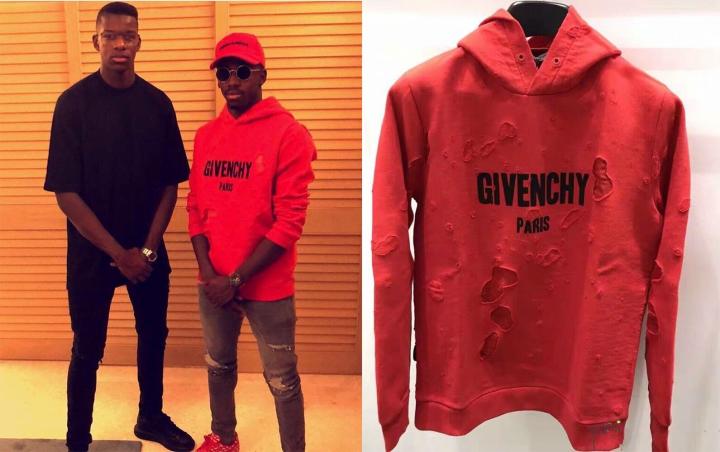 登贝莱这身就非常讲究了,上身依然是纪梵希的红色破洞连帽卫衣,配黑色紧身运动裤,鞋子是NIKE的空军一号鞋身全logo款。