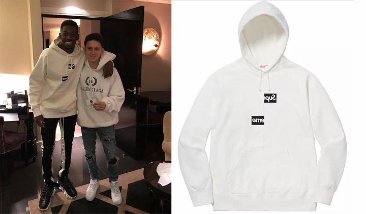 Supreme与CDG的联名套头卫衣网络售价4000RMB左右,下身则是黑白配色的运动长裤。