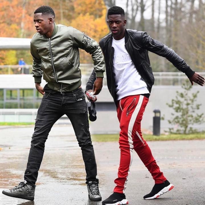 这套上身Gucci的翻领彩色条纹衬衫配下身配膝盖破洞牛仔裤,鞋子很像阿迪达斯的tubular系列跑鞋(但应该不是毕竟登贝莱是NIKE的签约球员...)但确实是一套相当不错的穿搭,上身复古下身现代化,有很强的时代冲击感。