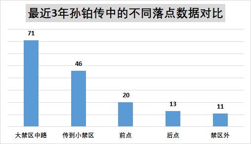 除去少数出界和被封堵的传中,孙铂的传中大多数都在禁区中路,其中落点在小禁区的有46次,大禁区中路有71次,落点很靠近球门,传球弧线和速度也足够。