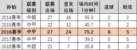 从最近几年的职业生涯来看,孙铂的黄金时期是在2016赛季,这是他作为主力出场次数和时间最多的一年,6球5助攻,表现堪称完美。
