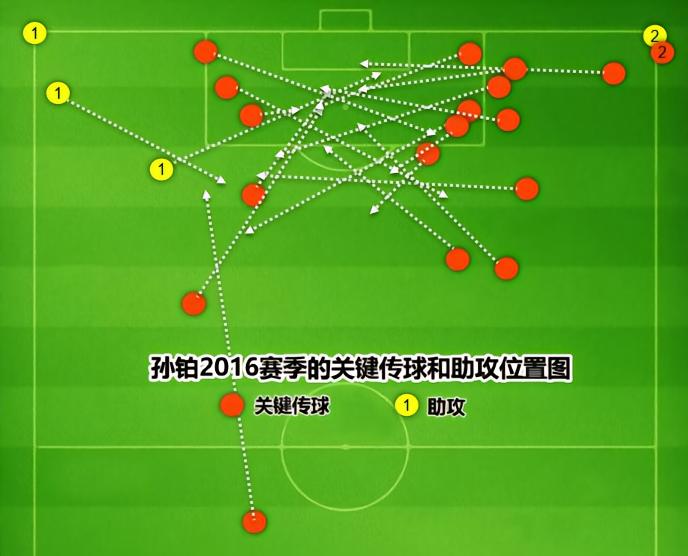 作为首发主力,孙铂在2016赛季的关键传球和助攻主要以边路传中和横线渗透为主,主罚定位球的表现也很出色。