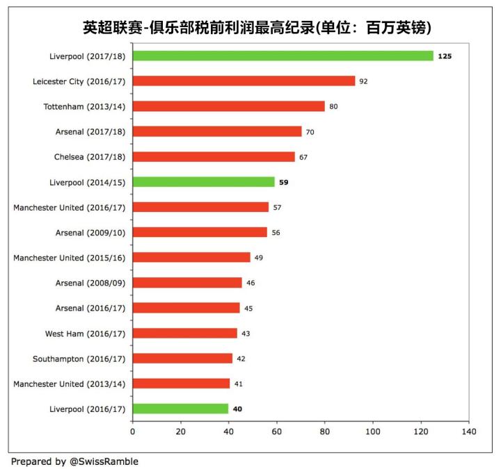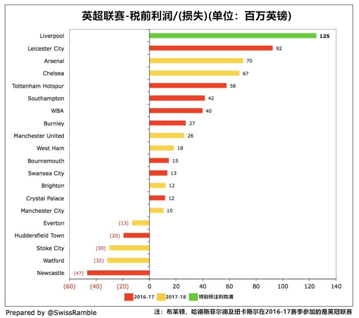 利物浦高达1.25亿英镑的税前利润不仅创造了俱乐部的纪录,也是2017-18赛季英超各家俱乐部的纪录。从下图中不难看出,税前利润相对较高的另两大豪门阿森纳(7000万英镑)及切尔西(6700万英镑)距离利物浦还有不小的差距。此外,有3家俱乐部上赛季在税前利润方面录得亏损,他们分别是沃特福德(亏损3200万英镑)、斯托克城(亏损3000万英镑)以及埃弗顿(亏损1300万英镑)。