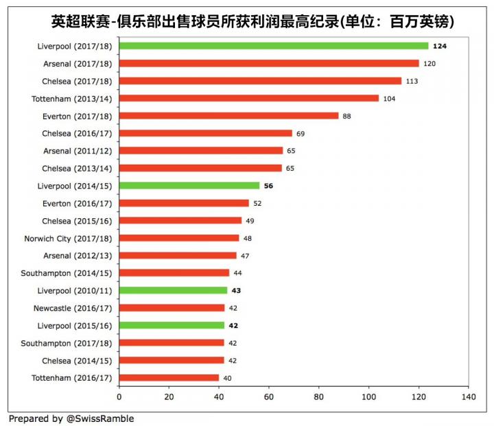 利物浦在上赛季录得的球员销售利润也是英格兰俱乐部的最高纪录。在红军身后,上赛季阿森纳及切尔西分别取得了1.2亿英镑和1.13亿英镑的利润,而热刺则在2013-14赛季通过出售球员获得了1.04亿英镑。利物浦上赛季的球员销售利润甚至比俱乐部此前的最高纪录——2014-15赛季的5600万英镑高了一倍多(当时球队将苏亚雷斯卖至巴塞罗那)。