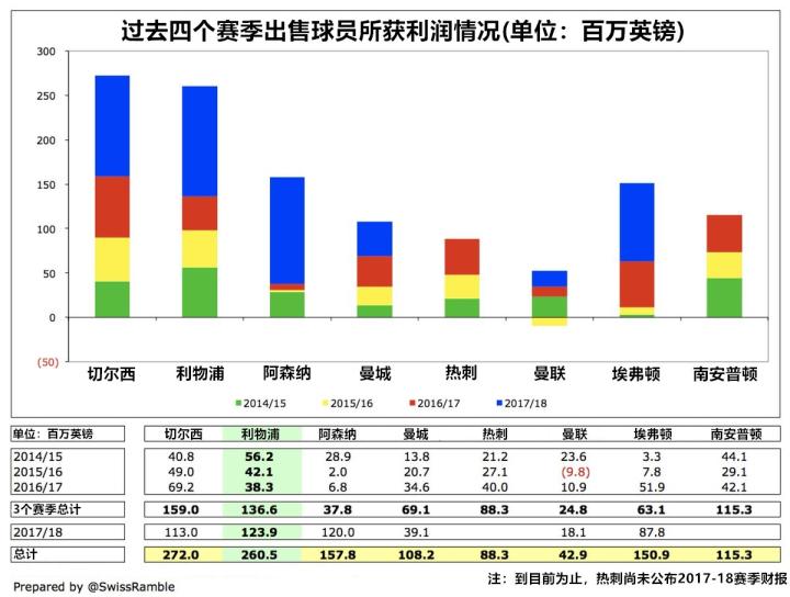利物浦经营模式中的关键组成部分是他们在球员销售方面的精明操作。在过去的4个赛季,他们在这一项获得的总利润高达2.61亿英镑;同一时期,只有切尔西的2.72亿英镑比他们更多。另外,阿森纳、曼城和曼联分别只有1.58亿英镑、1.08亿英镑及4300万英镑。
