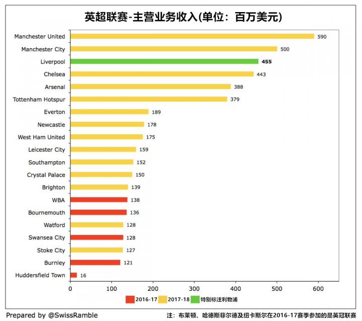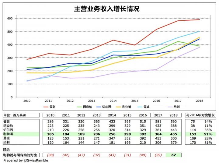 与2016年相比,利物浦的主营业务收入增长高达1.5亿英镑,同时期只有热刺提升幅度比他们更大(为1.7亿英镑,但其基数相对过低)。相比之下,其他豪门俱乐部的收入增幅相对更小:切尔西为1.14亿英镑、曼城为1.09亿英镑、曼联为7500万英镑、阿森纳则只有3800万英镑。