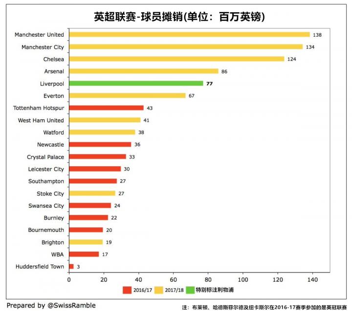 利物浦上赛季斥资1.95亿用于引进球员(包括萨拉赫、范戴克、张伯伦、索兰克等),这不但与此前的7600万英镑相比有着巨大的提升,更是创造了俱乐部的新纪录。不过这个数字仍与曼城的3.28亿英镑以及切尔西的2.9亿英镑有着很大的距离;利物浦的球员支出也同样不及曼联的2.43亿英镑,甚至少于埃弗顿的2.15亿英镑。