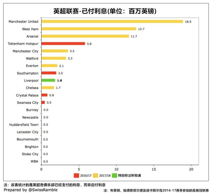 尽管芬威集团对利物浦的贷款利率从1.24%上调至2.44%,但利物浦上赛季仅支付了180万英镑,这个数字要比曼联的1900万英镑和阿森纳的1200万英镑少了很多。对比之下,西汉姆联支付了过去6年所积累的约1300万英镑利息;而热刺的利息支出则因新球场修建项目而提升至600万英镑。