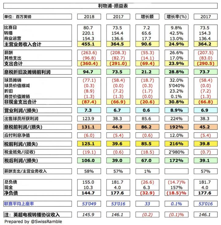 2017-18赛季,利物浦在英超联赛取得了殿军的成绩,同时他们在重回欧战赛场后的首个赛季令人惊讶地闯入到了欧冠决赛,最终遗憾负于皇家马德里。在利物浦不久前公布的财报中,相关的数据也与俱乐部的竞技成绩有着一定的联系。下面,Swiss Ramble将对利物浦的财报进行分析解读。