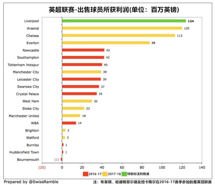在巨额的利润中,利物浦高达1.24亿英镑的球员销售利润占据了极大的比重,他们此前相继出售了包括库蒂尼奥、萨科、卢卡斯、斯图尔特等球员。如果剔除这个因素,俱乐部的利润可能只有100万英镑。而像阿森纳(1.2亿英镑)、切尔西(1.13亿英镑)和埃弗顿(8800万英镑)也在球员销售方面获得了相当多的利润。