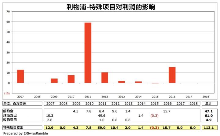利物浦在近年来出色的盈利能力也源于他们在过去两个赛季没有特殊项目支出。在2007-16年期间,俱乐部在这方面的成本支出累计高达1.13亿英镑,而这很大程度上源于(不成功的)球场扩建支出(6100万英镑)以及解雇主教练所支付的解约金(4700万英镑)。