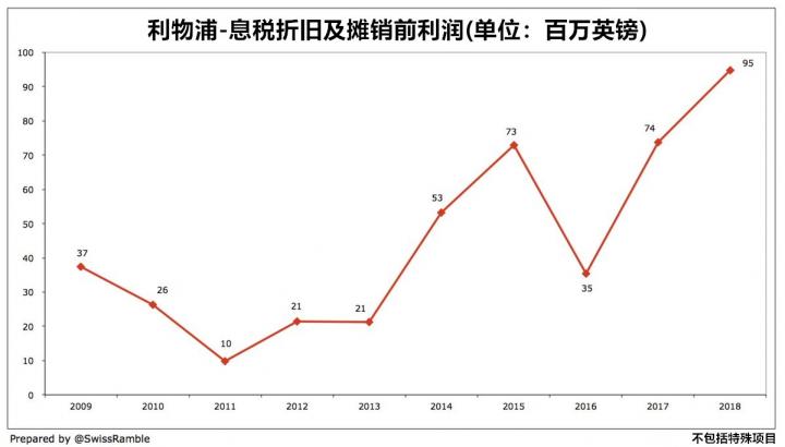 息税折旧及摊销前利润可以被视为营业利润的现金表现,它也剔除了球员销售和特殊项目的影响。我们可以从下图中看到,利物浦在这方面的利润从2016年的3500万英镑增长至2018年的9500万英镑,而这也创造了俱乐部的新纪录。