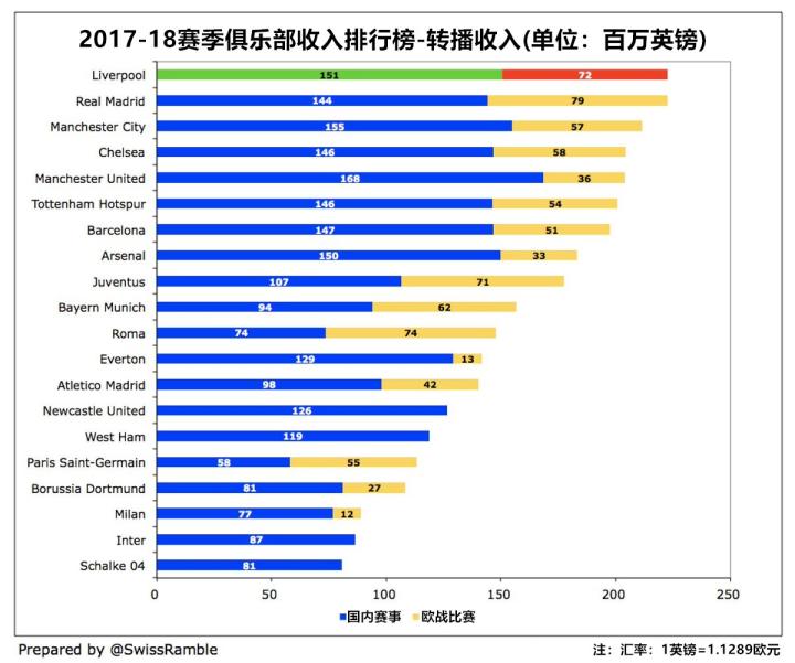 利物浦(与上赛季欧冠冠军皇马一道)成为了全世界获得电视转播收入最高的足球俱乐部,他们上赛季在这方面的收入达到了2.23亿英镑。紧随其后的是受益于英超巨额转播分红的4家俱乐部:曼城为2.12亿英镑,切尔西和曼联均为2.04亿英镑,而热刺为2.01亿英镑。