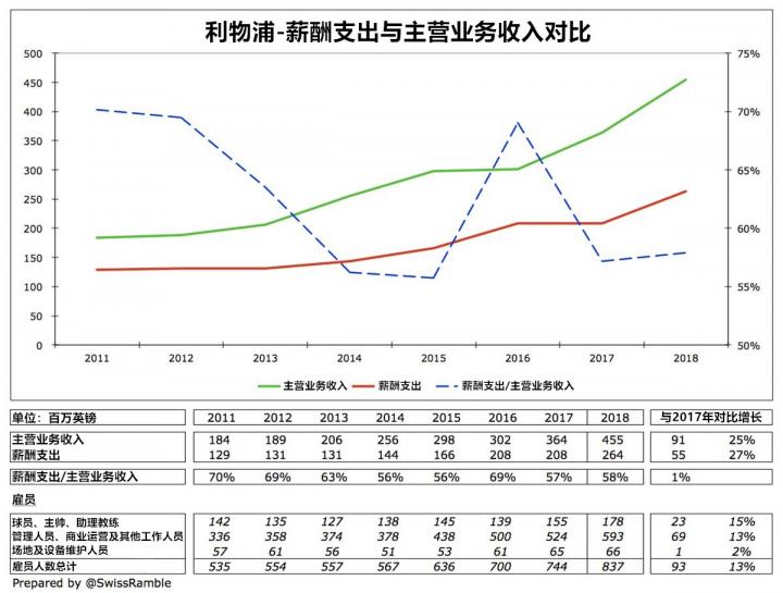 上赛季,利物浦的薪酬支出上涨了5600万英镑(增幅27%),达2.64亿英镑。不过由于主营业务收入增长了25%,因此薪酬支出占主营业务收入的比例仅从57%增至58%。薪酬支出提升的另一原因与欧冠联赛的奖金也有着一定关系,俱乐部的雇员人数从744提升至837。