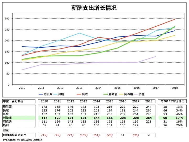 在英超六强中,利物浦过去3年来的工资增幅是最大的,9800万英镑的增加额甚至超过了曼联的9300万英镑。与此同时,这个增加额是同时期阿森纳3100万英镑的3倍多,或许这也能解释两家俱乐部自2015年以来截然相反的成绩走向。