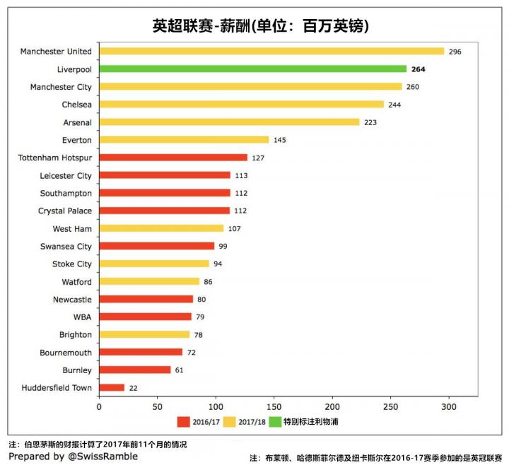 利物浦2.64亿英镑的薪酬支出如今排在英超各俱乐部的第2位,这个数字仅排在曼联的2.96亿英镑之后。不过有人从曼城独特的公司结构出发,认为统计中曼城2.6亿英镑的薪酬支出比实际情况少(比如说城市足球集团的各种相关财务操作等)。另一方面,切尔西的2.44亿英镑和阿森纳的2.23亿英镑与利物浦相比还存在着一定的差距。