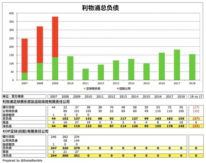 对比2017年,利物浦的总负债降低了2700万英镑,为1.55亿英镑。俱乐部对芬威集团的负债也降低了1000万英镑,缩减至1亿英镑;另一方面,利物浦拥有共计1.5亿英镑的信贷额度,而他们上赛季偿还了1700万英镑,将银行贷款规模缩减至5500万英镑。尽管俱乐部的财务统计中未单独列出与转会费相关的负债,但不难推测,利物浦应付账款从7600万英镑涨至1.48亿英镑很可能与此相关。