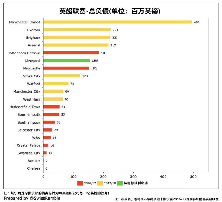 在英超各俱乐部中,利物浦1.55亿英镑的总负债排在第6位;相比之下,尽管格雷泽家族使用了各种再融资手段,但曼联高达4.96亿英镑的总负债仍令他们与其他俱乐部有着极大的差距。此外,利物浦的负债也要比他们的同城死敌埃弗顿的2.24亿英镑少。值得一提的是,利物浦的或有负债从2100万英镑上涨至4100万英镑。