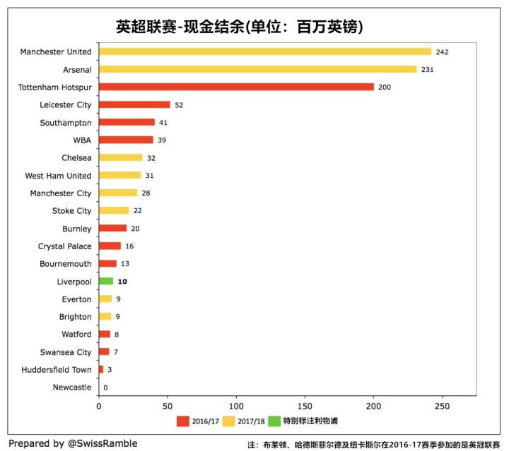 利物浦的现金结余仅有1000万英镑(此前为400万英镑),这个数字与曼联的2.42亿英镑及阿森纳的2.31亿英镑显然不在一个数量级。不过球迷们无需对这一点有什么忧虑,休斯对此解释称,“我们将所有的利润对俱乐部进行了再投资。”需要注意的是,热刺的2亿英镑现金结余(2016-17赛季统计数据)主要为新球场的预付贷款。