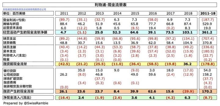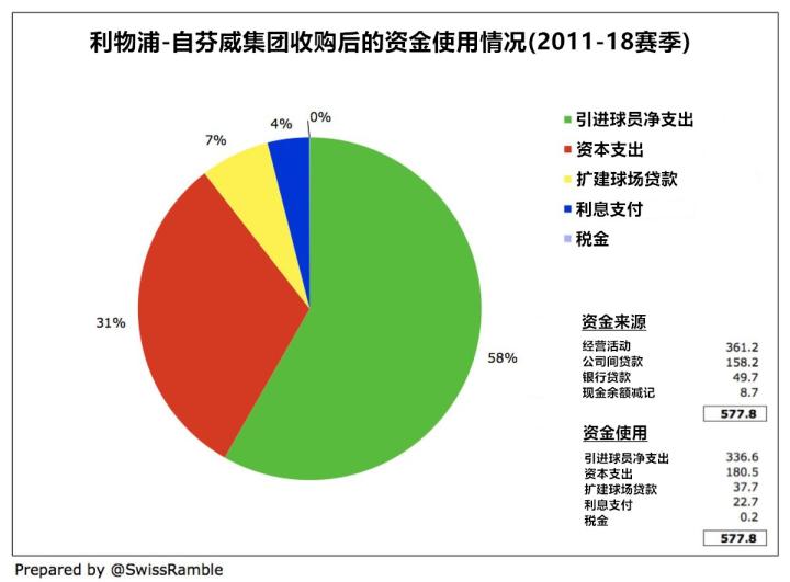自芬威集团接手利物浦后,俱乐部已经共计创造了5.87亿英镑的资金,其中3.61亿英镑来自于经营活动,1.58亿英镑来自于母公司贷款,5000万英镑来自于银行贷款。而在资金使用方面,其中3.37亿英镑用于引进球员(净支出),1.81亿英镑用于资本支出,3800万英镑用于球场扩建,2300万英镑用于偿还利息。