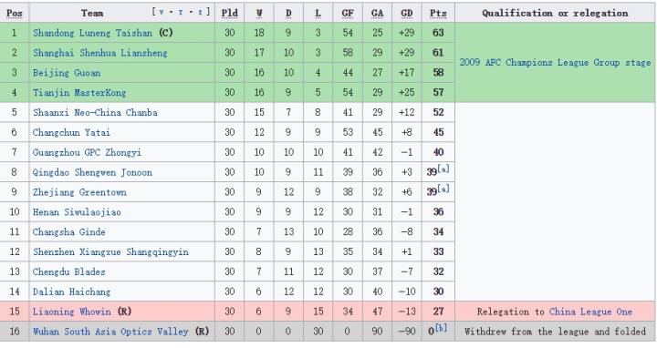 (图)2008赛季中超积分榜,来自维基百科
