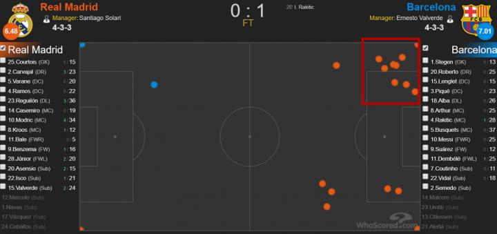 虽然罗贝托并不是一个以单防能力见长的球员,但他在这场比赛里得到了来自队友的鼎力协助。无论是身前的拉基蒂奇还是旁边的皮克,反正总有一个会在维尼修斯带球时拍马赶到,和罗贝托组成一个防下底、一个防传中的套路,然后把这个巴西小甜菜就这么套路了进去。