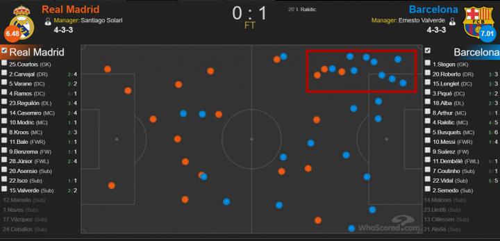 首先,皇马这场比赛的横向转移根本就没打几次,始终抱紧着左路的大腿。其次,皇马这场比赛的右路主攻手是理论上急切想要证明自己的大赛型选手贝尔,但这仅仅停留在了理论上。威尔士人此役存在感很弱,战术权重和个人状态都不在线,21次触球的数据低于包括替补三人组在内的任何一名队友。