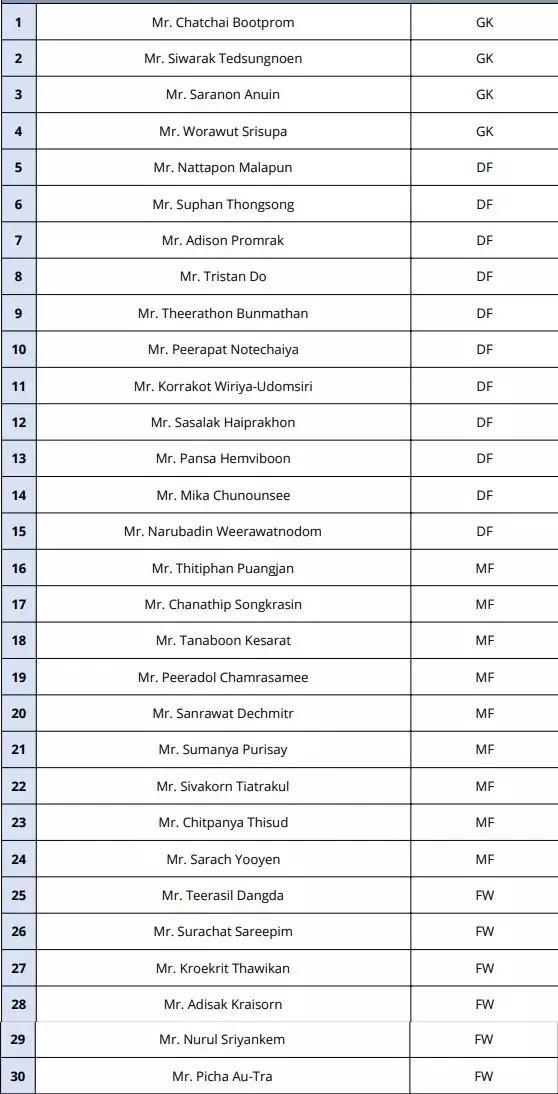 泰国队大名单公布,亚洲杯阵容再战中国杯!