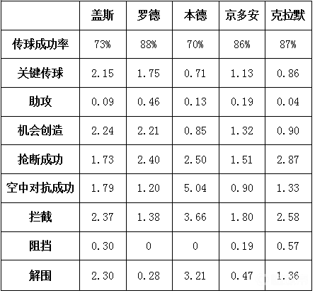 依照Squawka网站提供的统计数据,作者将盖斯与罗德、拉尔斯-本德、京多安、克拉默这些德国国家队级别的后腰作了比较,制表如下: