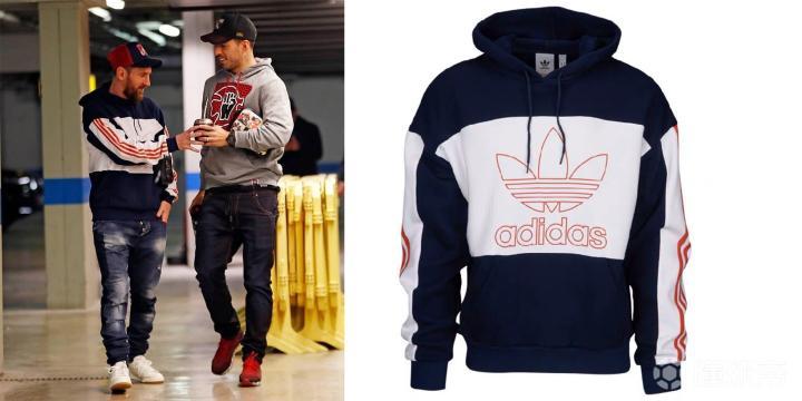 阿迪达斯拼接色logo套头卫衣网络售价600RMB左右,而旁边的苏亚雷斯穿的则是近年PUMA Suede的爆款卫衣网络售价也是600RMB左右