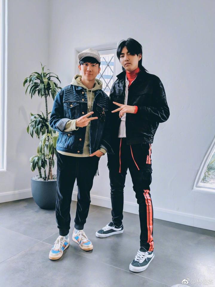 一套相对休闲的穿搭,牛仔外套内配绿色卫衣,下身则是黑色收脚运动裤加GUCCI的复古跑鞋,而身边的Young OG则发型瞩目,稍稍显胖。