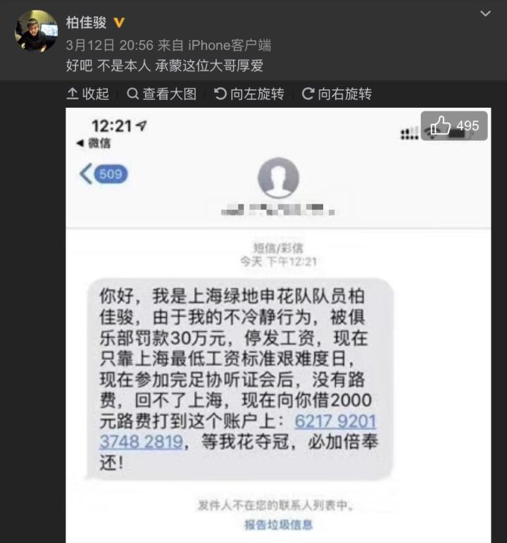 该骗子称:你好,我是上海绿地申花队队员柏佳骏,由于我的不冷静行为,被俱乐部罚款30万元,停发工资,现在只靠上海最低工资标准艰难度日,现在参加完足协听证会后,没有路费,回不了上海,现在向你借2000路费打到这个账户上:xxxxxxxxxxxx,等我花夺冠,必加倍奉还。