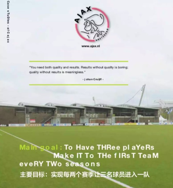 每一位从事足球相关工作的人都听说过“希望在未来”。足球青训基地必须卓而不凡,才能培养出像克鲁伊夫,范巴斯滕和博格坎普这样的天才球员。但是,培养足球人才的关键不在于硬件配备,而在于俱乐部的发展理念。和阿贾克斯俱乐部打交道的人会很快注意到, 这里的人会用“我们”来形容阿贾克斯俱乐部。这一点凸显了阿贾克斯俱乐部员工共管共治的特点。阿贾克斯俱乐部发展理念的另一个基础是攻势足球。阿贾克斯俱乐部的足球思想是:踢球只求胜利,而没有美感会很无趣,而只追求美感,却不管结果,那会是徒劳无功。阿贾克斯俱乐部发展理念的第三个重点是让青训学院为俱乐部一队输送球员。阿贾克斯俱乐部通常不会购买球员(除非没有适合的候选人),并且鼓励青训学院每两个赛季向一队输送三名新毕业球员。我们的青训体系的目标是:在阿贾克斯俱乐部青训学院的指导下,实现常规性的青少年球员向成年天才球员的过渡。最优秀的青少年球员,哪怕年龄在16、17岁之间,只要他们能力出众, 就肯定能升入俱乐部一队。但是现代足球经济也有其不利的影响,阿贾克斯俱乐部现在也将自身视作球员加工厂。阿贾克斯通过青训学院培养出毕业生后, 会将他们留在俱乐部几年,提高他们的能力,然后将竞技状态处于巅峰的他们交易给不想培养青少年球员,只希望购入球员的俱乐部。