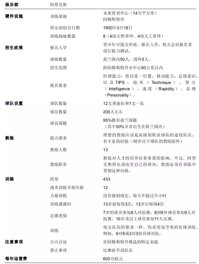 阿贾克斯俱乐部青训学院包括各个年龄段的队伍,即有5岁儿童组成的队伍, 也有U19, 预备队这样的青年队。学员在学院会接受不同年龄段的培养方案, 包括竞技能力,技战术和社会人文。学员的文化课学习不是学院的核心培训重点,训练过程会与学龄儿童的日常作息结合,学龄儿童放学后乘坐大巴来到学院,由学院提供作业和课程辅导。