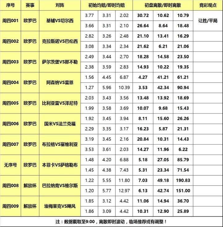 [关于离散] 竞技体育分析指数,也就是各家欧指分歧度。基本原理:百家欧指平均值与每家指数差值的绝对值的求和。离散度小则各家观点接近,进而赛果易打出;离散度大反之意见分歧大,赛果不易打出。又因各方因素影响下指数变动,离散在特殊时刻具有更高参考价值,切勿盲目参考运用。换句话说,离散只是参考指数,而非结论性数据!以下是各场数据汇总(数据截取至9:00):