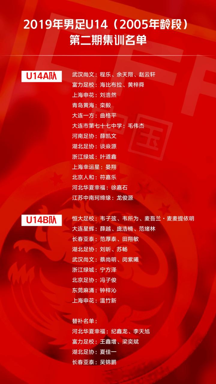 在今年2月中旬,中国足协公布了关于组织2019年男足2005年龄段U14国少A、B队第二期集训通知(2月27日-3月13日),U14A队主教练为西班牙人贝拉,技术总监为前国脚彭伟国。
