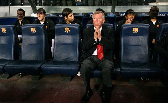 2008年4月23日,2007-08赛季欧洲冠军联赛半决赛首回合,巴萨主场与曼联0:0战平,这是两队交锋史上唯一一场没有进球的比赛。紧张的曼联主帅弗格森。