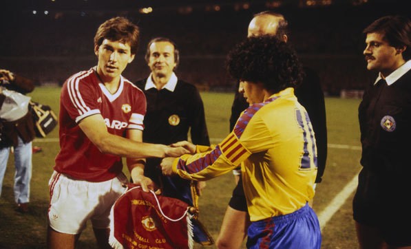 1984年3月7日,1983-84赛季欧洲优胜者杯1/4决赛首回合,巴萨主场2:0胜曼联,当时曼联队长罗布森与巴萨队长马拉多纳握手。