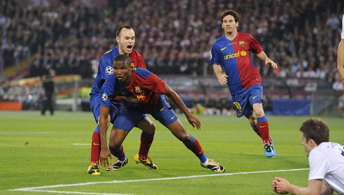 2009年5月27日,2008-09赛季欧洲冠军联赛决赛,巴萨2:0战胜卫冕冠军曼联,最终夺冠。埃托奥上半时第一脚射门就为巴萨取得进球。